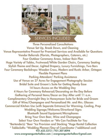 14-hours use of lodge, dressing rooms and grounds on the big day. 4 hours provided on the day before the event for decoration and rehearsal (additional fees apply if you desire to hold your rehearsal dinner in the lodge, comes complimentary with whole property overnight packages).